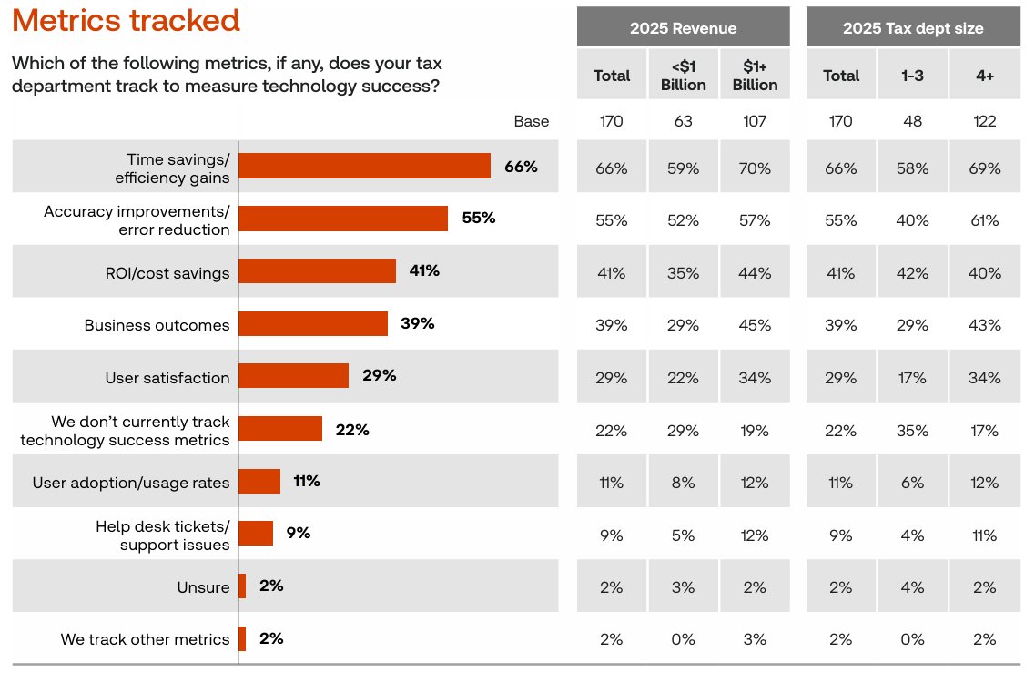 To avoid basing my conclusions on a single report, I had a quick look at what the “Big Four” think about this. The consensus is that measuring “adoption” or “accuracy” alone is no longer sufficient; tax departments must now prove their impact on the enterprise P&L and growth speed.